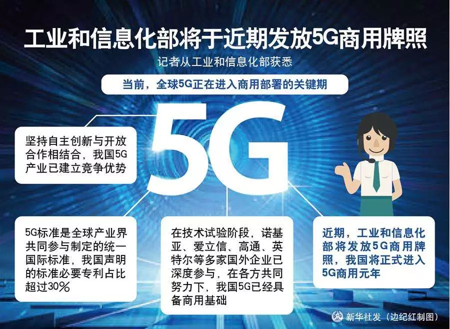 6月3日中午,新华社发布消息:近期,工业和信息化部将发放5G商用牌照,我国将正式进入5G商用元年。