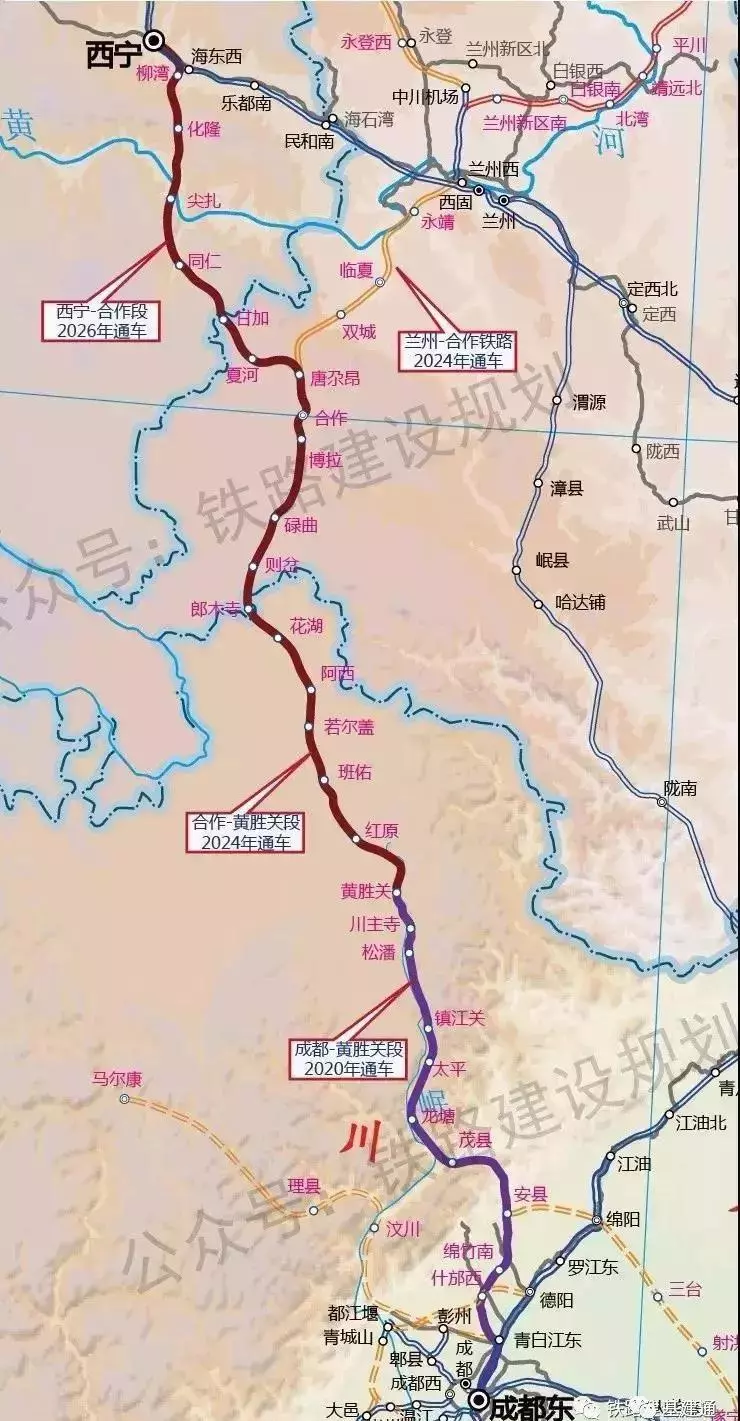 最新动态丨5月17日,西宁至成都铁路西宁至黄胜关段环境影响第一次评价公示在四川阿坝州人民政府网站发布。根据公示内容,明确了西宁至成都铁路合作至黄胜关先期开通(五年半工期),西宁至合作后期开通(七年工期)。预计兰州至合作铁路将和西成铁路合作至黄胜关段同步建设、同步开通,确保成兰铁路通道先期建成。