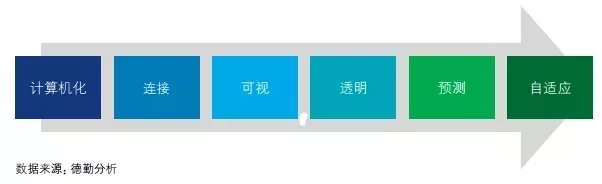 企业数字化能力素质体现在其利用数据指导生产以及系统自优化的能力。我们借鉴国际普遍认可的工业4.0发展路径,将企业智能化成熟度分为六个阶段:计算机化、连接、可视、透明、预测和自适应。