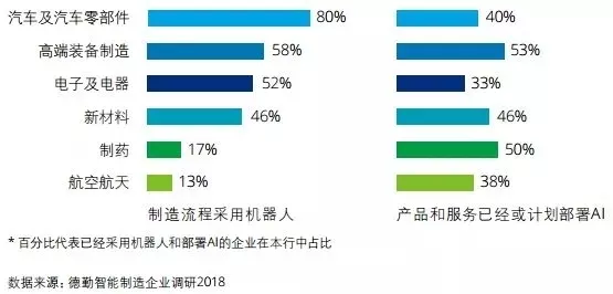 人工智能正迅速渗透各行各业。汽车及汽车零部件制造、高端装备制造、电子及电器制造三个行业在制造流程中采用机器人的比例过半。汽车及零部件制造行业使用机器人的企业比例达到80%,预示未来工业机器人的市场增量将主要来自非汽车行业。在产品和服务领域已 经或计划部署人工智能的行业分布比较均匀,高端装备制造和制药比例较高,但其他行业如新材料、汽车及零部件、航空航天、电子及电器也正在或计划部署人工智能。