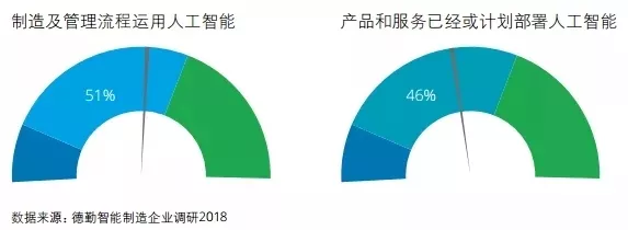 德勤智能制造调研发现,51%的受访企业在制造和管理流程中运用人工智能,46% 的受访企业在产品和服务领域已经或计划部署人工智能(见下图)。制造和管理流程中人工智能的运用更偏向系统自动化和制造精益化,目的是提高生产效率和产品质量,同时人也被解放出来,可以去思考更复杂的问题。主要应用场景包括使用机器人实现流程自动化、柔性制造、定制化生产、质量检测等。在产品和服务领域人工智能的运用更侧重产品和服务与使用者的互动,典型应用包括研发和新品测试、用户行为分析、自动驾驶等。