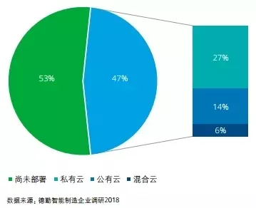德勤调研发现,中国制造企业云部署积极性不高。53%的受访制造企业尚未部署工业云,47%的企业正在进行工业云部署,其中27%的企业部署私有云,14%部署公有云,6%部署混合云(见下图)。上云可以大幅降低每个单元的储存和计算成本,甚至通过跨界创造新的商业模式,但也带来了复杂性。企业担心一旦将诸如工厂生产过程、资产性能管理的数据放到 云平台上之后,信息安全、知识产权问题会接踵而至。除此之外,很多企业尚未明 确工业云在企业层面的商业应用和相关能力欠缺也是导致企业云部署积极性不高的原因。
