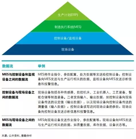 德勤调研结果显示,目前企业致力于打通从ERP到MES乃至现场设备的数据流,但这也仅是从生产到执行的打通,未来 还需将产品数据、供应链数据串联。我们将生产数据流分为两个环节:一、打通生产计划与执行系统的数据流;二、执行与监控和现场设备的数据流。
