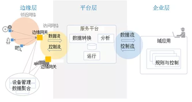 这个架构设计描述了工业互联网系统的内外三层结构。从边缘层,到平台层,再到企业层,如果我们把它看作是一个球体的话,外面就是设备端的边缘层,中间是平台层(工业互联网平台,主要指这一部分。当然现在也有将工业互联网平台泛化的趋势),最内层是企业层。在边缘层上主要是边缘的网关,采集各种各样的数据;送到平台层之后,平台层对数据做必要的处理和分析;分析完之后,再送达企业层,送到企业的应用系统。企业会根据不同的应用做不同的分析,做出判断和决策,将数据再往回传送到平台层和边缘层,直至送达企业内外联接的各个部门和单位。