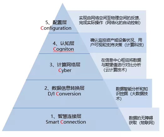工业4.0或者工业互联网的目标,不仅要把内部网、外部网连起来,而且要变成一个智能物理系统(CPS)。二者都可以通过一个“5C(五层)”结构来表述。