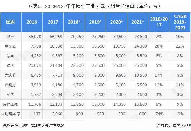 意大利机器人销量比2016年增加19%,达7713台。2017年,法国机器人市场持续上升,其机器人销量增加16%,约为4900台;西班牙机器人销量约为4200台,创历史新高。