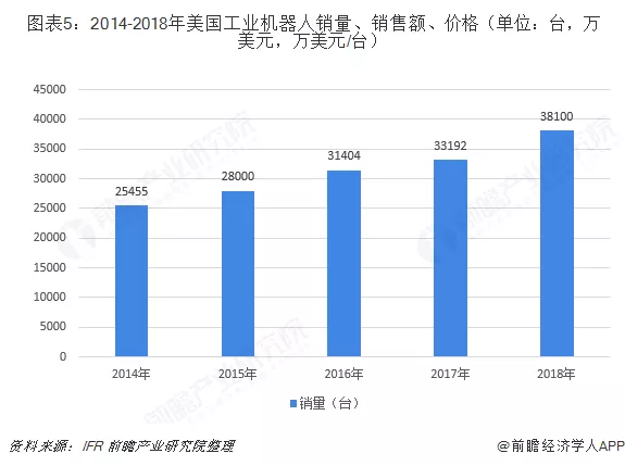 在2018年上半年,汽车行业的采购订单量确实是在下降,但其他的行业却在以创纪录的速度增长,同比增长约20%。比如生命科学、食品与消费品等行业中的机器人采购订单量实际上都在上涨。美国并没有进行大量工业机器人的生产。这些工业机器人主要是在欧洲或日本生产的,现在有些是在中国生产的。美国擅长的是集成,拥有优秀的系统集成商渠道。美国先进自动化产业协会A3(包括美国机器人工业协会(RIA)、先进视觉与影像协会(AIA)和运动控制和机电协会(MCMA)等子团体)根据IFR数据,2017年美国工业机器人销量约为3.3万台。2018年约为3.81万台。