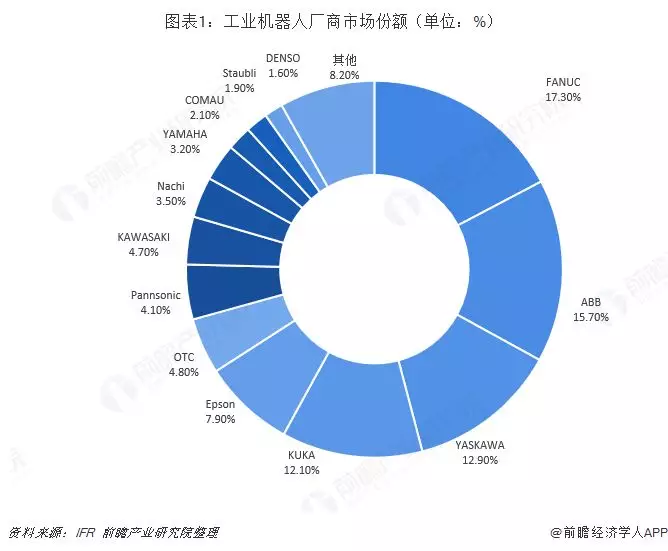 从企业来看,ABB、发那科(FANUC)、库卡(KUKA)和安川电机(YASKAWA)这四家企业仍是工业机器人的四大家族,成为全球主要的工业机器人供货商,占据全球约50%的市场份额,其中发那科(FANUC)的销售占比最高,占比达到百分之17.3。