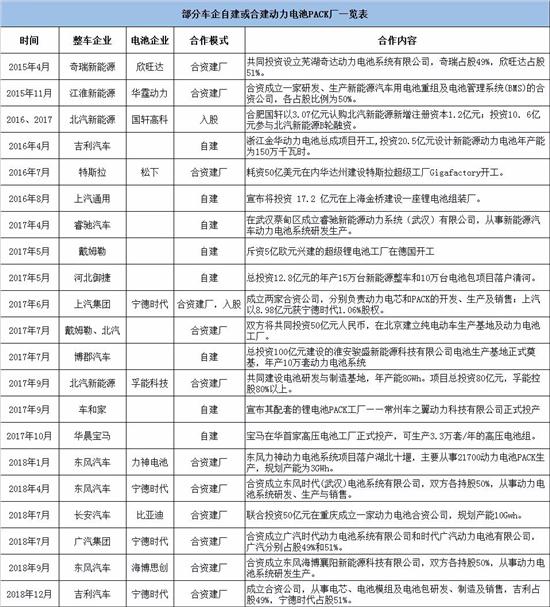 目前车企建设动力电池工厂模式主要分两种,第一种是车企自建工厂,例如吉利汽车在2018年9月成立湖北吉利衡远新能源科技公司并建设动力电池工厂,该工厂投资总额为80亿元,预计2020年建成投产。