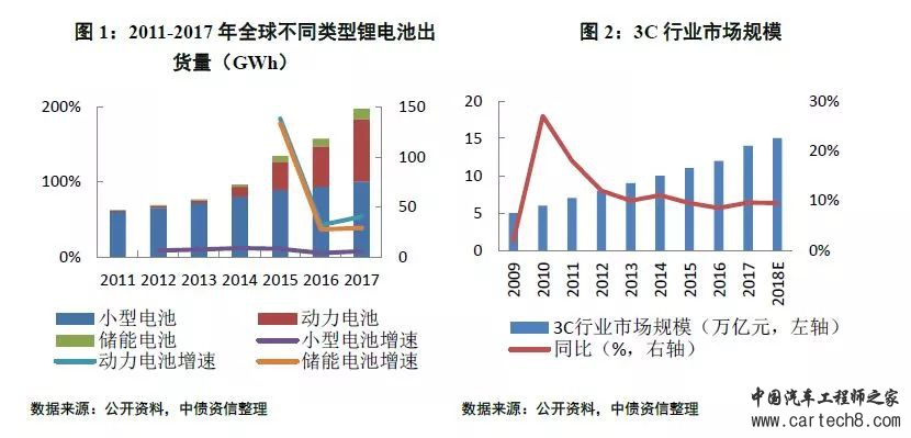 从市场发展速度看,由于3C行业市场规模增速在2010年左右达到峰值后持续下滑,市场逐渐趋于饱和,消费类锂离子电池增速持续下滑,虽然2017年略有反弹,但整体增速仍低于10%。2014年以来,全球新能源汽车行业的迅速发展,使得锂电池行业出货量近四年以每年27%的速度高速增长。截至2017年末,动力电池出货量达到62.35GWh,占锂离子电池出货量比例已提高到42%。此外,2015~2017年,储能电池保持40%左右的增速,但在锂电池出货量中占比仍然较小。