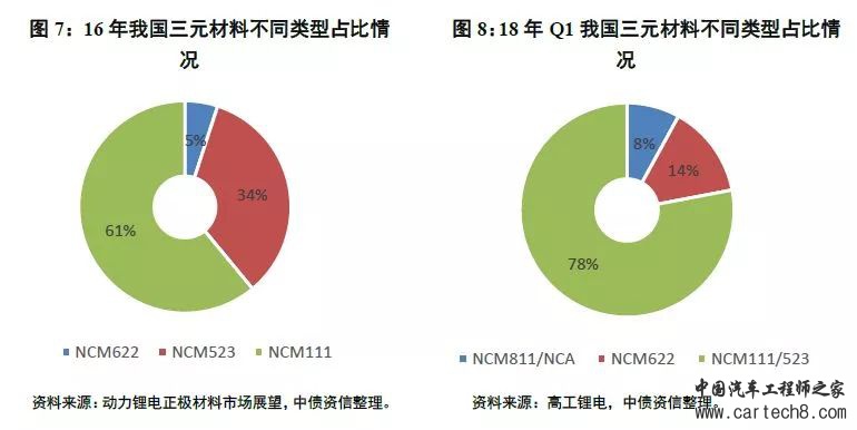 目前动力电池行业最新技术为高镍三元锂电池,主要包括NCA和NCM811。其中,NCA为镍钴铝的混合,常见配比为8:1.5:0.5,单体能量密度可达300Wh/kg,高于目前能量上限约为280Wh/kg的NCM811电池,为目前世界上能量密度最高的锂离子电池。NCA生产环境极为严苛,生产成本及技术要求高。目前,对于最新的高镍三元锂电池技术,日韩主要选择NCA,但产量不高,主要的原因为市场需求不足。国内在NCA技术上仍不成熟,因此在高镍三元领域主要选择了NCM811。部分正极材料企业和电池企业已小批量出货,但商业化程度仍然较低。随着产业政策要求的不断升级、技术的不断成熟以及下游中高端车需求量的不断上升,预计2020年以后高镍电池的市场份额将逐步增长。2016年,上游三元正极材料出货量中NCM111、NCM523和NCM622占比分别为61%、34%和5%。但到2018年一季度,MCM111已经退出市场,NCM523占比上升为78%,成为行业主流;同时NCM622上升为14%,高镍三元材料亦有少量出货。