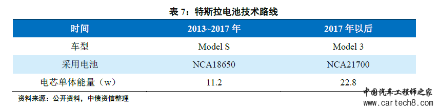 从发展历史看,圆柱电池为最先采用的电池封装形态,目前生产已标准化,主流型号为18650和21700[21700圆柱电池中“21”指电池直径为21mm,“70”指高度为70mm,“0”代表圆柱体型的电池]。之后出现的方型电池(一般采用铝壳),单体电池体积比圆柱电池更大,成组时缝隙更小,单位体积的电池包中结构件更少,重量更轻,因此,在单体电池在组成系统时能量密度下降幅度更小[根据美国阿贡实验室测算,圆柱型成组后能量密度下降约40%,方型电池成组后能量密度下降30%]。此外,方型电池的充放电倍率、循环寿命和安全性等方面也好于圆柱电池。因此在以磷酸铁锂和三元材料(NCM523和NCM611)为主流的背景下,目前市场上主要为方型电池,圆柱电池主要被用在微型车和电动工具上,在乘用车和商用车领域占比较低[2018年上半年,国内15.58GWh里电池装机中,方型占比76%,圆柱占比11.5%,软包占比12.5%]。但是,圆柱电池在新能源汽车也不是完全没有机会。圆柱电池虽然重量较大,成组后系统能量密度下降较多,但是该形态电池技术成熟、生产效率高、PACK成本低、电池良品率以及电池组一致性好、散热快,便于多种形态组合,因此已实现与NCA、NCM811等高镍材料的较好结合。目前,搭载了NCA正极材料的21700型号圆柱电池已应用于特斯拉Model3上,能量密度可达300Wh/kg。未来圆柱电池的发展方向或向对续航里程要求较高的高端乘用车用高镍三元锂电池发展,且型号由18650向体积和容量更大的21700发展。