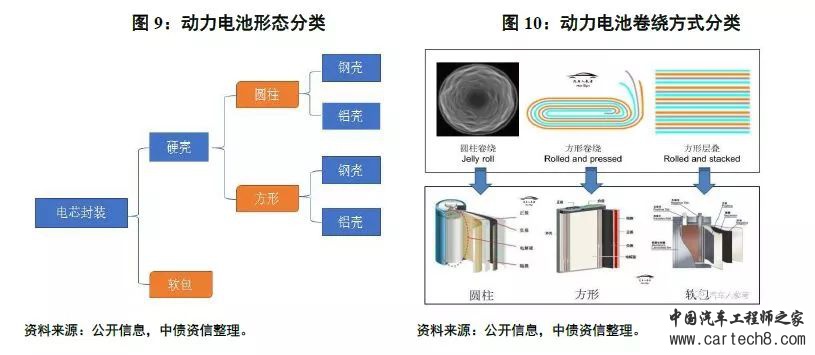 动力电池按照形态和包装方法则分为圆柱电池、方型电池和软包电池。其中圆柱电池和方型电池属于硬包,外壳主要为钢壳或铝壳(价格低廉)。软包电池外壳主要为铝塑膜(价格昂贵)。