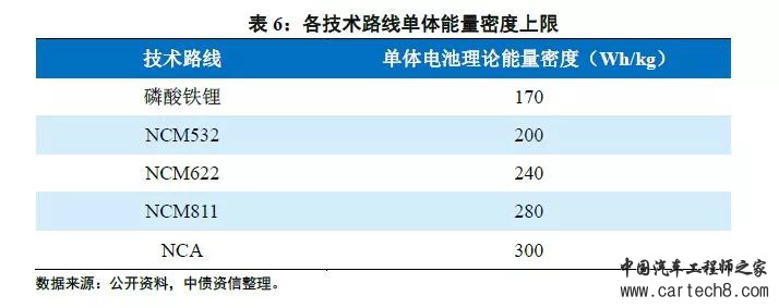 三元电池可以看做是钴酸锂、锰酸锂和镍酸锂电池的混合升级版,中和了三种电池在能量密度和安全性、循环性方面的优缺点,成为动力电池领域主流技术路线之一。根据正极材料中镍钴锰三种金属比例不同,三元电池可以细分为NCM111、NCM532、NCM622、NCM811等。例如NCM532即为三元电池中镍、锰、钴的比例为5:3:2。一般来说,三元电池中,镍的含量越高,电池能量密度越高(详见表6),但安全性越差。