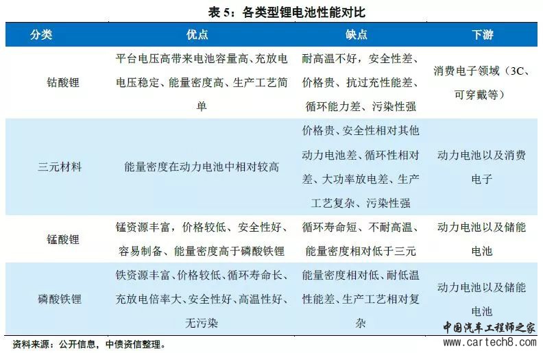 虽然钴酸锂电池能量密度高,但成本高、安全性差,因此主要被应用于3C领域。三元电池、磷酸铁锂电池、锰酸锂电池虽然能量密度方面不及钴酸锂电池,但因在安全性、循环性等方面优势明显,因此被广泛应用于动力电池领域。2017年,动力电池市场中磷酸铁锂和三元电池出货量几乎各占一半,锰酸锂电池占比较小。三元材料在电池能量密度、比功率、大倍率充电、耐低温性能等方面占据优势,但成本、循环性、安全性上弱于磷酸铁锂电池。加之政策引导因素,因此新能源汽车市场中,客车采用的电池以磷酸铁锂为主,轿车以三元电池为主。