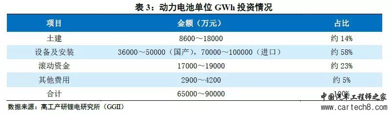 动力电池项目投资主要包括土建、设备及安装、流动资金等。其中,土地方面,据统计,一般建设1GWh产能约需用地100~150亩,购地成本差别较大,但普遍处于2000~3000万之间;建筑工程费约6600~15000万元。生产设备方面,根据设备是否进口、设备技术路线和设备自动化程度,价值差异较大。一般来说,国外先进生产线价格明显高于国内生产线价格(国产设备价格区间3.6~5万元、进口设备7~10万元);一体化生产线明显高于组装生产线价格;软包叠片技术生产线价格明显高于硬包卷绕式生产线。此外,流动资金和其他税费约1.7~1.9亿元。总体看,国内主流动力电池厂商单位GWh投资约6.5~9亿元。