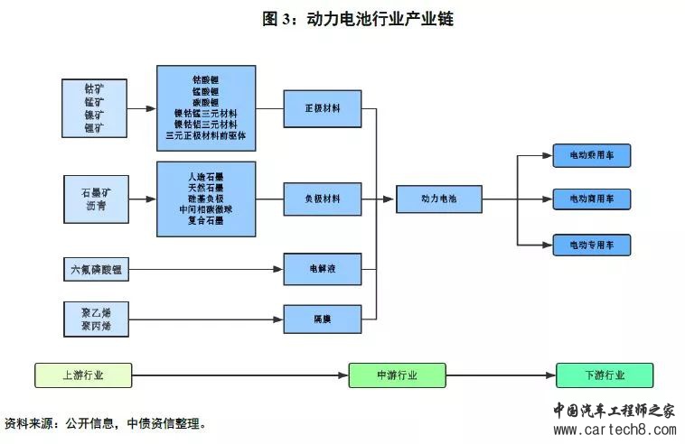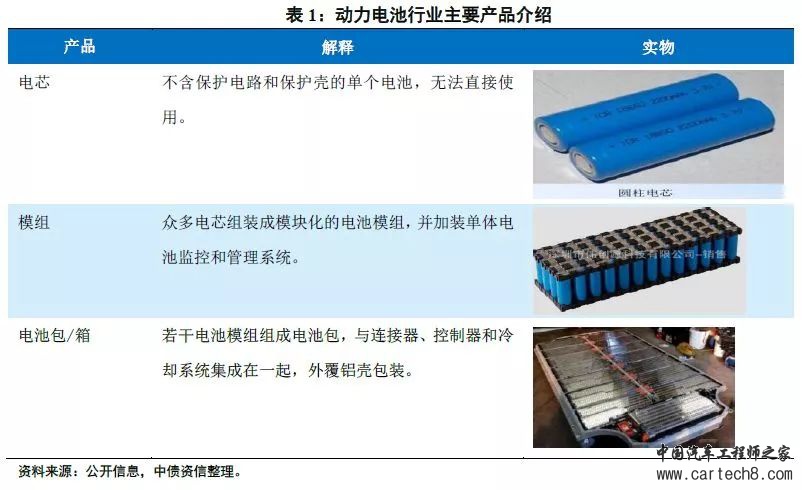 动力电池行业处于新能源动力产业链的中游。上游主要为生产电池所需原材料(正极、负极、电解液、隔膜、包装物、其他零部件)等产业链环节以及再上游的金属材料生产和矿产资源开采环节(锂、钴、猛金属化合物的冶炼和钴矿、锰矿、镍矿、石墨矿开采等)。下游主要为新能源汽车企业[按汽车种类分为乘用车、商用车和专用车,按动力来源分为纯电动车和混动车]。动力电池企业主要产品为电芯、电池模组和电池包(详见表1)。此外,由于部分电池企业仅生产电芯并将电池包(PACK)业务外包,因此在电池企业和车企之间,还派生出一些专门做模组和PACK的细分行业。