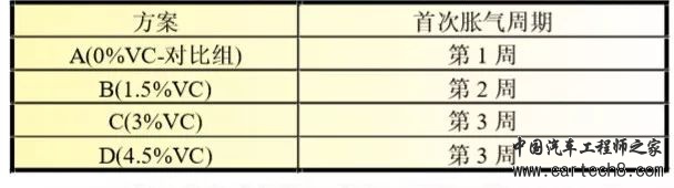 表1 不同VC含量电解液电池首次胀气对应的周期