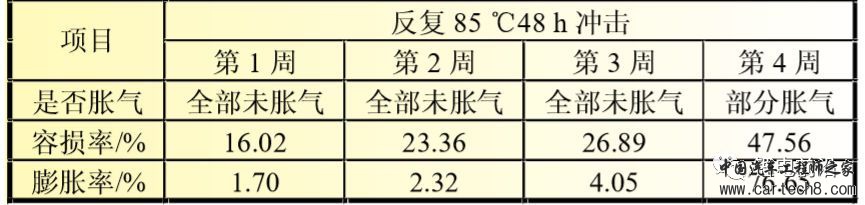在天赐TC-E233H型号电解液中添加 3%VC 添加剂,电池经卷绕注液后,①85℃静置8h→②化成→③40℃静置24h→④去气封边→⑤平压→⑥分容;即结合2.1节&2.2节实验中的最佳方案,制作成电池,经85 ℃48 h反复热冲击、评估其首次胀气的周期、容量损失率、膨胀率;然后取分容后新电池,再次经85 ℃48 h 反复冲击,冲击周数必须为出现首次胀气周数的前一周(例如:假设第5次出现首次胀气,那么取第4周),最后以0.5C评估遭受热冲击后临近胀气边缘前的循环性能。由表3可知,结合 2.1 节 &2.2 节实验的最佳方案制作的新电池,其耐高温能力更强,可保证85 ℃48 h反复冲击3次不胀气,且膨胀率也在1%~5%以内。