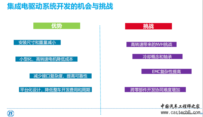采埃孚集团电驱动事业部跨系统集成业务单元亚太区负责人王岳总结了电驱动系统集成化的优势和挑战,如下图所示。集成化的电驱动桥实现了驱动电机、功率控制器、变速器、差速器等部件的全面集成,成本更低、体积更小、效率更高,适用于不同平台的设计和应用,为车辆节省大量空间。当然,集成化的电驱动桥也面临很多挑战,比如高转速带来的NVH问题、冷却难题、功能安全问题、EMC复杂性提高、跨零部件开发协同难度增加等。