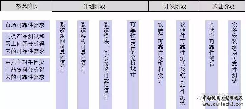 在概念阶段,汇总所有可靠性需求;在计划阶段,从设备组网、架构设计、冗余设计、FMEA设计等方面,对可靠性哦啊进行考虑。