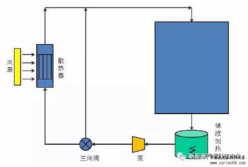 此处预热是指,在低温气候下,车辆长时间停放,电池包及热管理系统的散热器、管路以、冷却液温度都极低,如果依靠锂电池自身的电量加热,一方面温度过低,可能低于电池允许放电的下限温度,根本无法实现供电加热;另一种情形,即使能够供电,系统内阻大且放电能力差,电池系统自身消耗大量的电能,而电量的消耗直接影响接下来的续航。为了应对这种情形,有设计人员考虑了预热策略。