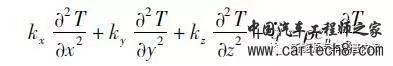 一个经过大量简化的模型如下面公式所示:其中,各项系数K表示锂电池在长宽高各方向上的导热系数,T为温度,q是电池单位体积的热生成率,ρ代表电池密度,cp为电池比热容,t为时间。