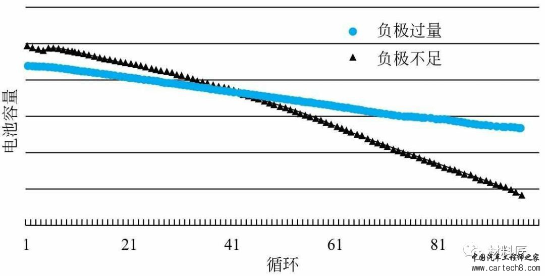 图1、石墨负极不足和负极过量时电池性能趋势图
