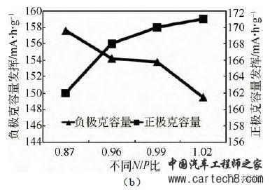 图3(a)不同N/P 比对电池容量的影响(b)不同N/P 比对正负极克容量发挥影响
