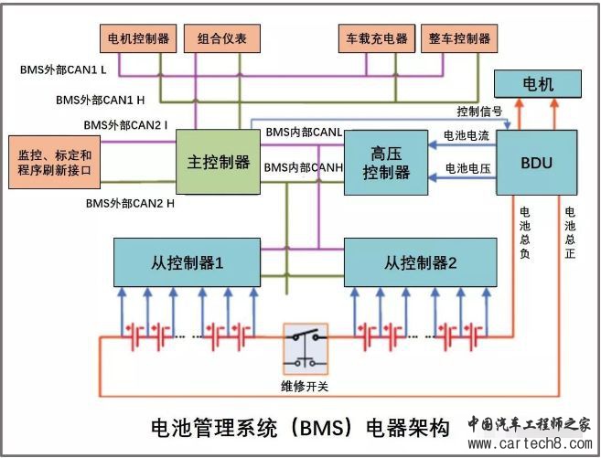 硬件的设计和具体选型要结合整车及电池系统的功能需求,通用的功能主要包括采集功能(如电压、电流、温度采集)、充电口检测(CC和CC2)和充电唤醒(CP和A+)、继电器控制及状态诊断、绝缘检测、高压互锁、碰撞检测、CAN通讯及数据存储等要求。