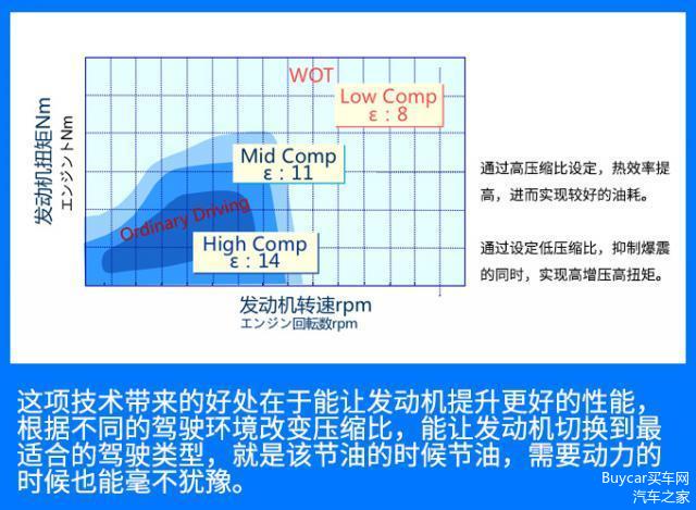 根据驾驶场景,改变压缩比,通过这一手段,使发动机快速切换至最适合驾驶场景的类型。同一台发动机 上同时获得油耗性能与动力性能。