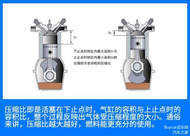 所谓压缩比是指将吸入的空气(混合气)压缩到何种程度。压缩的越多,膨胀的越大,因此能做更多的功。效率也就越高。