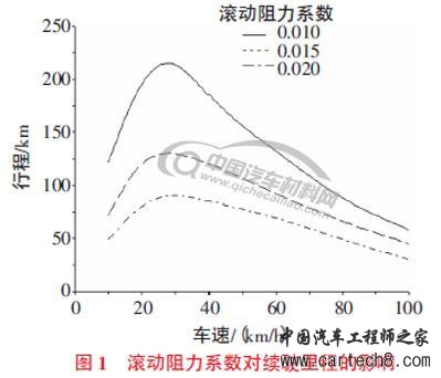 轮胎的胎压、直径和材料等因素都会影响轮胎的滚动阻力,进而影响汽车经济性。图1 示出滚动阻力系数(f)对一次充电续驶里程的影响。从图1 可以看出,轮胎的滚动阻力是轮胎对汽车经济性影响的最主要因素,汽车经济性随滚动阻力的增大而降低。