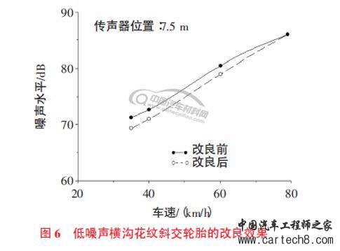 相比于内燃机汽车,电动汽车由于去掉了发动机这个巨大的噪声源,使得高速行驶时的胎面噪声变得更为突出。低滚阻轮胎不仅可以节省能耗,还可以降低车轮滚动时的噪声,使得电动轿车行驶起来更为安静。轮胎低噪声化技术的开发主要着眼于胎面的花纹。可以通过改变轮胎胎面横沟的角度和宽度来改善噪声特性。图6 示出型号为100.0- 20 14PR 的低噪声横沟花纹斜交轮胎的改良效果。文献(轮胎噪声与滚动阻力的相关性)曾对该轮胎进行轮胎/道路噪声和滚动阻力测试,该试验中的5 条轮胎选用不同增强材料。试验表明,在不增大车辆外部噪声的前提下,可以通过改变轮胎的增强材料来降低轮胎的滚动阻力。对于车辆内部噪声,结果并不一致,轮胎的增强材料使轮胎的刚性增大,传递给车辆悬挂系统和整车结构的振动噪声也将会增大。