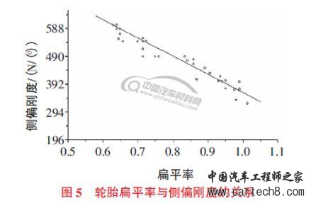 扁平化,即轮胎断面结构的高宽比越来越小。轮胎断面高宽比与滚动阻力呈现正相关,高宽比减小,轮胎变形减少,滞后损失相应地降低,从而减小了轮胎滚动阻力。扁平率对轮胎侧偏刚度影响很大,如图5 所示,扁平率小的轮胎,接地面积会变宽,成反比关系的侧偏刚度便会提高,故采用扁平率小的宽轮胎是提高侧偏刚度的主要措施。