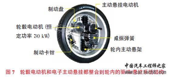 米其林研发了将轮毂电动机和电子主动悬挂都整合到轮内的驱动/悬挂系统,如图7 所示。通过整合,可以省略大量的传动部件,降低车载自重;简化车辆,利于汽车的结构布局;实现多种复杂的驱动方式。同时,该整合利于对制动能量的回收,提高对车轮控制的动态响应以及便捷的新能源汽车技术的应用。