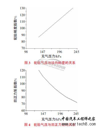 高胎压一方面可以增加轮胎本身刚度,降低轮胎滚动阻力,另一方面也会增大轮胎径向刚度,破坏车辆的平顺性,同时减小轮胎的回正力矩,降低车辆的操纵稳定性。胎压与径向刚度、回正力矩的关系,如图3 和图4所示。可见,高胎压有利有弊,对于不同的汽车使用条件,必须对胎压作具体分析,确定最合适的轮胎气压。