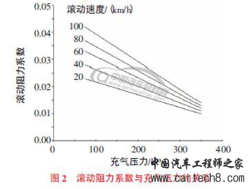 图2 示出滚动阻力系数与充气压力的关系。从图2可以看出,胎压越高,轮胎滚动阻力越低,这是由于高胎压增大了轮胎本身的刚度,从而降低了滚动产生的变形以及由此产生的滞后损失。轮胎滚动时所消耗的能量与速度成正比,若速度增加,轮胎的温度就会升高,能耗也就增多。欲使轮胎高速行驶,并保持良好的轮胎寿命和承载能力,需要提高气压,减小变形。