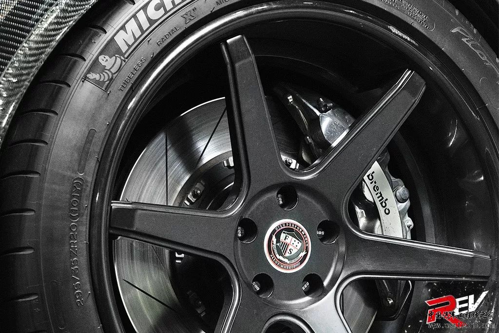 为了符合碳纤维外观,车主为这台GT-R选用了一套定制的20寸的哑光黑锻造轮毂,并且搭配一套米其林的Pilot Super Sport轮胎,前轮尺寸为295/30/20,后轮尺寸为335/30/20,以此获得最大程度的抓地力。