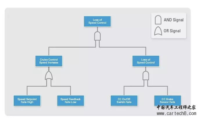 完成FMEA后,设计工程师会添加一些功能来减缓识别到的风险最大的故障。 例如,他们可以添加传感器来检测机械组件的故障,然后软件会自动将车辆切换到跛行回家模式,以防止进一步损害。 测试这些补救措施是ECU验证和确认的关键部分。如果要为每个故障设计相应的测试用例,需要设计团队提供故障树分析(FTA)。 图10显示一个FTA的例子。