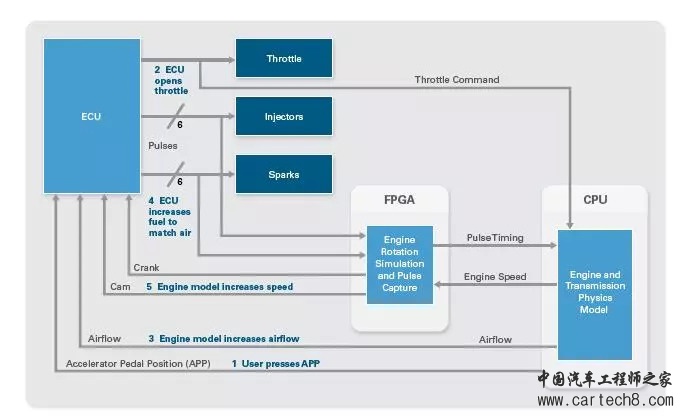 前面讨论的ECU信号、FPGA上的APU协处理器以及发动机物理模型相结合,就构成了一个闭环发动机ECU HIL测试仪。图7显示了该系统基于实际执行器负载的数据流。