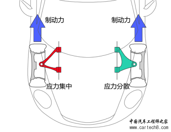 麦弗逊悬架的下摆臂平面大,加上各种圆角设计后,就可以分散应力,使下摆臂有更高的强度(如下图右侧);相比之下,采用拉杆结构的应力就比较集中(如下图左侧),所以说,轻量化的结构都是有代价的。