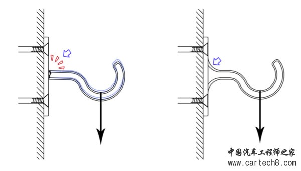既然说到应力这个问题,那就花点笔墨聊清楚。下面是两种墙体挂钩结构,明显第一个就容易折断,因为挂钩根部有锐角凹陷,造成了应力集中;第二个挂钩在根部采用了大面积圆弧设计,应力分布均匀,有更高的强度。
