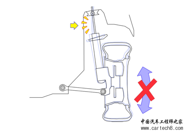 上图就很形象地说明,车轮为什么不能出现蓝色箭头方向的摇摆,因为减振器把这个自由度“锁住”了。因此减振器必须设计得足够强壮,否则在巨大的侧向力下,会“弯掉”的(黄色箭头处)。麦弗逊悬架的汽车在车轮处发生侧撞时,减振器几乎逢撞必弯,就是这个道理。