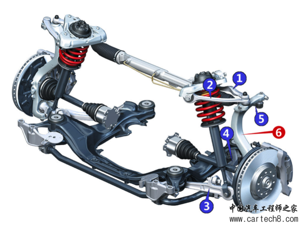 2.同样也是因为零件少,整个悬架的跳动部分就更轻,就更有利于驾控制。如果说下图的多连杆悬架有5根控制臂跟着轮子一起跳,那么麦弗逊悬架就只有2根(1根A臂+1根转向拉杆)。除此之外,图中还多出一根粗大的“脊梁骨”,用于连接所有连杆(下图6号零件)。仅在这一点上,如果多连杆悬架还敢用铁材质,那就已经输给麦弗逊了。