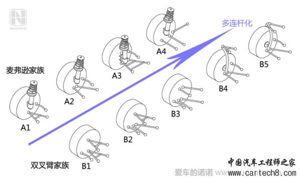 这是一张诺诺总结绘制的悬架家谱,你在任何教科书和网络上一定没见过(略弯的连杆为转向拉杆,看不清的话可以单击图片放大)。其实,前独立悬架就这两大流派,各自遵循了悬架的核心公理而不断演进,并都朝着连杆化的趋势发展。至于大家朗朗上口的“多连杆悬架”,究其本质,就是双叉臂演化而来的,我们只要把这两大家族的元老——A1(经典麦弗逊)和B1(经典双叉臂)说清楚了,其他悬架类型就可以几句话说明白了。