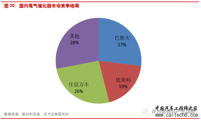 在排放升级的背后有一个常常被大家忽略的现实——目前国内汽车尾气催化剂市场基本为国外企业所垄断。(德国巴斯夫、英国庄信万丰、比利时优美科)打个比方,没有催化剂的后处理系统只是一副“空壳”,要让后处理系统真正催化转化地动起来,必须为其注入“灵魂”。