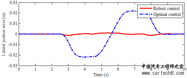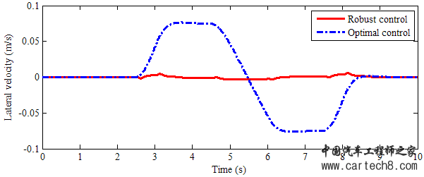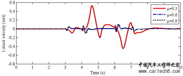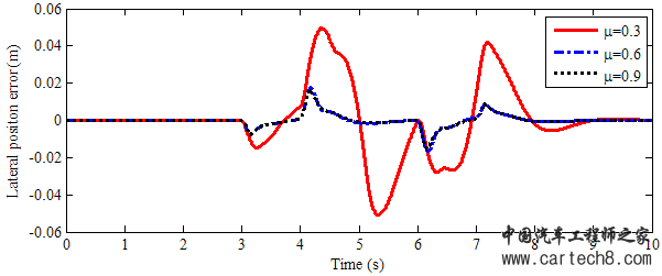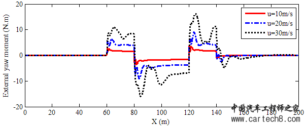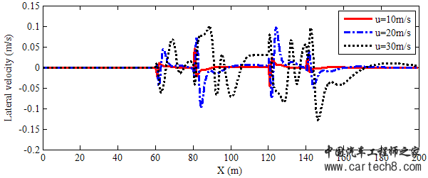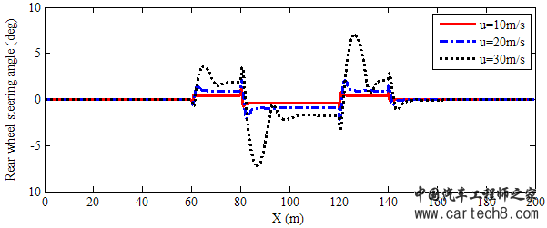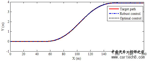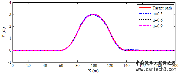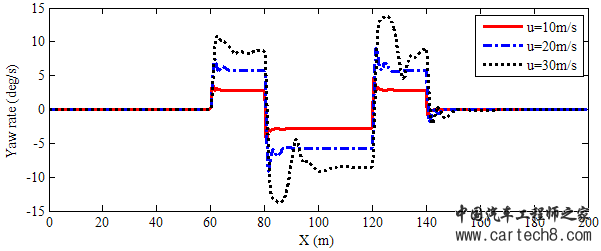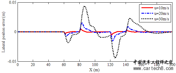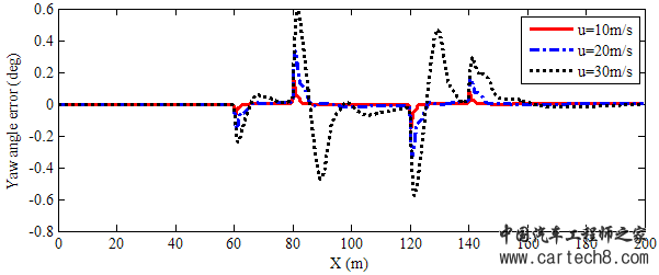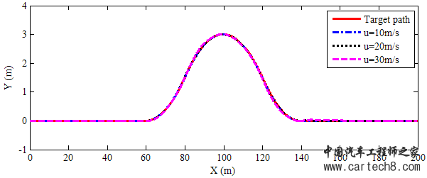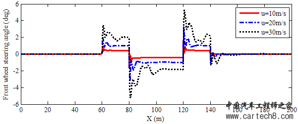 在设计控制器前,假定车辆的纵向速度为恒定。然而,这并不能在实际中实现。为了解决这一问题,在鲁棒控制器设计过程中考虑了纵向速度的摄动。图(10)显示了不同纵向速度(u=10m/s,u=20m/s,u=30m/s)下双移线变道策略的仿真结果。考虑到不同的纵向速度导致了通过目标路径的时间不同,在这种情况下的仿真结果参考纵向位移而不是时间,以便于更好地显示。