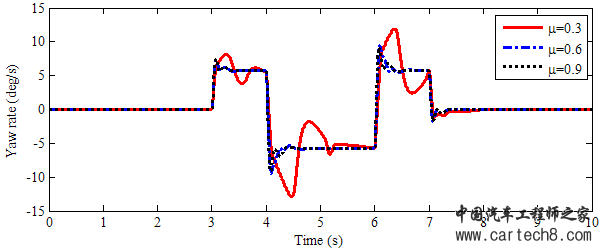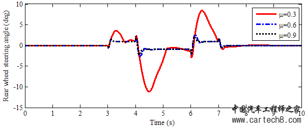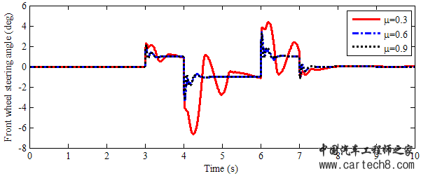 这个仿真实例的目的是评估之前提出的鲁棒控制器的鲁棒性。在不同的纵向速度和摩擦系数下,四轮独立转向电动车实行双移线变道策略。