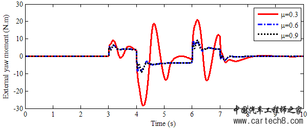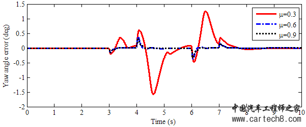 图9表明了在不同道路下双移线变道策略的结果,(结冰道路μ=0.3,湿路μ=0.6,干路μ=0.9)。从图9(a)、(b)、(c)中可以看出,在高摩擦系数下控制器输出的峰值低于低摩擦系数下的峰值,且低摩擦系数下的波动更为显著。在不同道路条件下的侧向速度和横摆角速度分别示于图9(d)、(e)。可以看出随着摩擦系数的增加,侧向速度和横摆角的振幅减小。图9(f)、(g)显示横摆角和侧向位置的跟踪误差,从中我们能够清楚地看出,结冰路面条件下路径跟踪误差比高摩擦系数路面条件下的更大。不同道路条件下的实际路径在图9(h)中进行了比较。很明显,四轮独立转向电动车在高摩擦路面条件下具有较好的路径跟踪性能。然而我们还发现,即使是低摩擦系数路面情况的路径跟踪绝对误差也很小,这意味着所设计的控制器在不同的路面状况下具有很强的稳定鲁棒性和良好的性能鲁棒性。